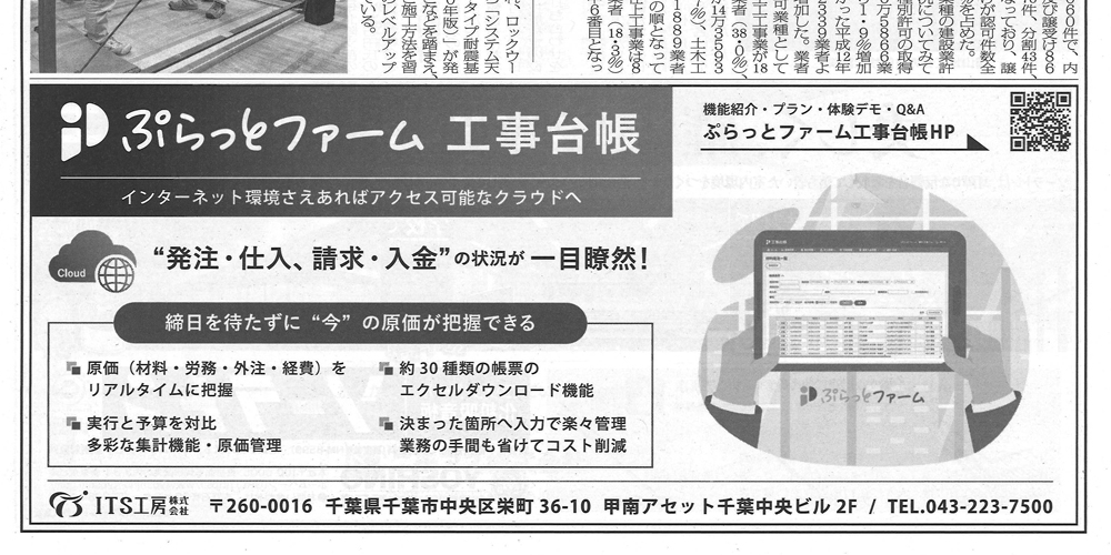 全室協ニュース第340号にITS工房の新サービスとなるぷらっとファーム工事台帳の広告を掲載しました。